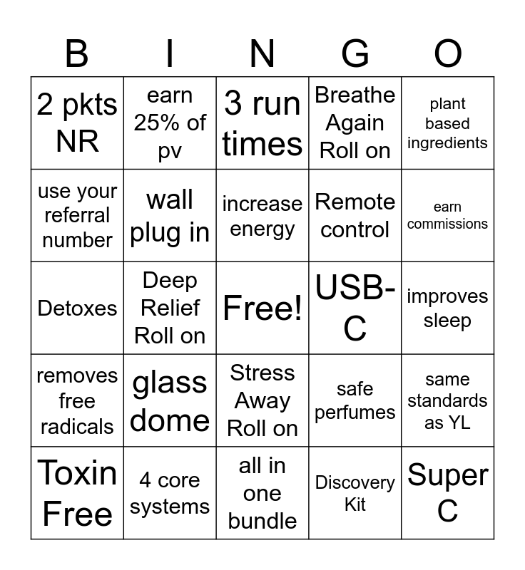 This bingo card has a free space and 29 words: Toxin Free, Antibacterial, Deep Relief Roll on, Allerzyme, 2 pkts NR, 3 run times, wall plug in, glass dome, USB-C, 4 core systems, improves sleep, Super C, all in one bundle, Discovery Kit, earn commissions, match diffuser, Stress Away Roll on, removes free radicals, plant based ingredients, Detoxes, safe perfumes, Lavender Lemon Peppermint, Remote control, use your referral number, Breathe Again Roll on, earn 25% of pv, same standards as YL, increase energy and weight loss.