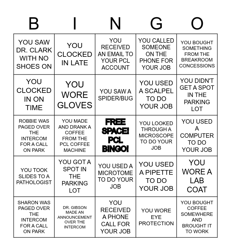 This bingo card has a free space and 24 words: YOU GOT A SPOT IN THE PARKING LOT, DR. GIBSON MADE AN ANNOUNCEMENT OVER THE INTERCOM, YOU SAW A SPIDER/BUG, SHARON WAS PAGED OVER THE INTERCOM FOR A CALL ON PARK, YOU BOUGHT SOMETHING FROM THE BREAKROOM CONCESSIONS, YOU SAW DR. CLARK WITH NO SHOES ON, YOU CLOCKED IN ON TIME, YOU CLOCKED IN LATE, YOU LOOKED THROUGH A MICROSCOPE TO DO YOUR JOB, YOU USED A MICROTOME TO DO YOUR JOB, YOU USED A SCALPEL TO DO YOUR JOB, ROBBIE WAS PAGED OVER THE INTERCOM FOR A CALL ON PARK, YOU USED A PIPETTE TO DO YOUR JOB, YOU WORE A LAB COAT, YOU WORE GLOVES, YOU WORE EYE PROTECTION, YOU USED A COMPUTER TO DO YOUR JOB, YOU RECEIVED AN EMAIL TO YOUR PCL ACCOUNT, YOU DIDN'T GET A SPOT IN THE PARKING LOT, YOU MADE AND DRANK A COFFEE FROM THE PCL COFFEE MACHINE, YOU BOUGHT COFFEE SOMEWHERE AND BROUGHT IT TO WORK, YOU TOOK SLIDES TO A PATHOLOGIST, YOU CALLED SOMEONE ON THE PHONE FOR YOUR JOB and YOU RECEIVED A PHONE CALL FOR YOUR JOB.