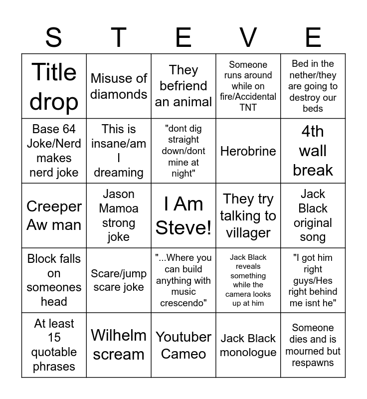 This bingo card has a free space and 24 words: Scare/jump scare joke, Wilhelm scream, "dont dig straight down/dont mine at night", At least 15 quotable phrases, Bed in the nether/they are going to destroy our beds, Title drop, Base 64 Joke/Nerd makes nerd joke, Misuse of diamonds, They try talking to villager, "...Where you can build anything with music crescendo", Herobrine, Creeper Aw man, Jack Black reveals something while the camera looks up at him, "I got him right guys/Hes right behind me isnt he", This is insane/am I dreaming, Jack Black monologue, Jack Black original song, They befriend an animal, 4th wall break, Jason Mamoa strong joke, Someone dies and is mourned but respawns, Block falls on someones head, Someone runs around while on fire/Accidental TNT and Youtuber Cameo.