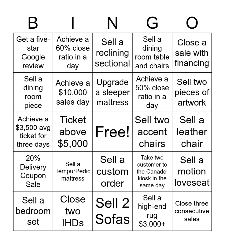 This bingo card has a free space and 29 words: Sell a bedroom set, Sell a power sofa, Ticket above $5,000, Book two IHDs, Get a five-star Google review, Sell a reclining sectional, Achieve a $10,000 sales day, Sell a TempurPedic mattress, Sell two accent chairs, Close two IHDs, Sell a leather chair, Close three consecutive sales, Sell 2 Sofas, Sell a high-end rug $3,000+, Sell two pieces of artwork, Book an IHD follow-up appointment, Sell a custom order, 20% Delivery Coupon Sale, Close a sale with financing, Achieve a $3,500 avg ticket for three days, Take two customer to the Canadel kiosk in the same day, Email the team information about a new casegood collection, Achieve a 50% close ratio in a day, Sell a dining room piece, Sell a dining room table and chairs, Achieve a 60% close ratio in a day, Sell a motion loveseat, Upgrade a sleeper mattress and Complete two room plans.