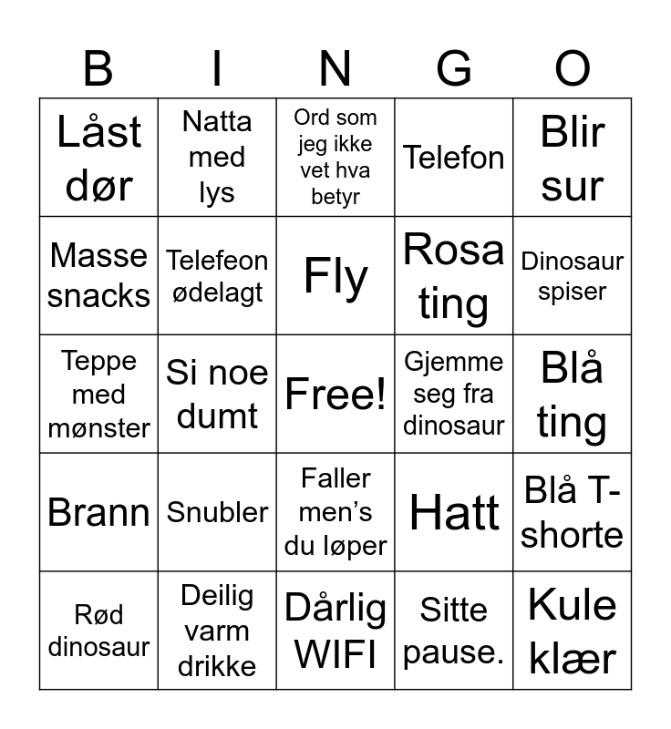 This bingo card has a free space and 29 words: Rød dinosaur, Gule øyne, Si noe dumt, Stjerner., Låst dør, Ord som jeg ikke vet hva betyr, Telefeon ødelagt, Snubler, Gjemme seg fra dinosaur, Deilig varm drikke, Blå ting, Kule klær, Dårlig WIFI, Sitte pause., Dinosaur spiser, Nesten dør på dum måte, Faller men’s du løper, Brann, Blir sur, Teppe med mønster, Hatt, Søt dinosaur, Rosa ting, Masse snacks, Telefon, Natta med lys, Blå T-shorte, Fly and Solen er fin.