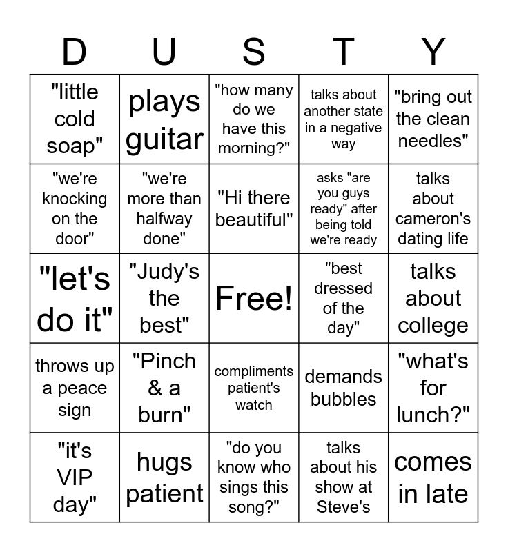 This bingo card has a free space and 24 words: "Pinch & a burn", hugs patient, "Hi there beautiful", "it's VIP day", "bring out the clean needles", "little cold soap", "we're knocking on the door", plays guitar, "best dressed of the day", compliments patient's watch, asks "are you guys ready" after being told we're ready, "let's do it", demands bubbles, "what's for lunch?", "we're more than halfway done", talks about his show at Steve's, talks about college, "how many do we have this morning?", talks about cameron's dating life, "Judy's the best", comes in late, throws up a peace sign, talks about another state in a negative way and "do you know who sings this song?".