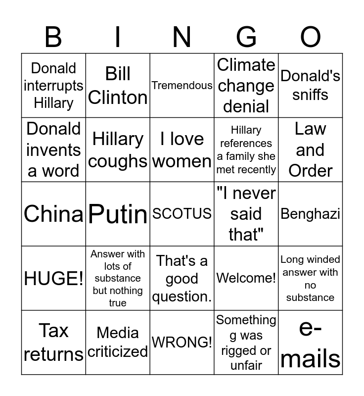 This bingo card has 25 words: Answer with lots of substance but nothing true, WRONG!, I love women, Tax returns, Donald's sniffs, Donald interrupts Hillary, Donald invents a word, Bill Clinton, "I never said that", That's a good question., Hillary references a family she met recently, China, Welcome!, Long winded answer with no substance, Hillary coughs, e-mails, Benghazi, Tremendous, Law and Order, Putin, SCOTUS, Media criticized, HUGE!, Climate change denial and Something g was rigged or unfair.