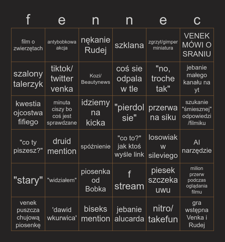 This bingo card has 36 words: f stream, piosenka od Bobka, jebanie alucarda, szalony talerzyk, "co ty piszesz?", "pierdol sie", tiktok/ twitter venka, biseks mention, zgrzyt/gimper miniatura, piesek szczeka uwu, jebanie małego kanału na yt, szklana, milion przerw podczas oglądania filmu, minuta ciszy bo coś jest sprawdzane, coś sie odpala w tle, film o zwierzętach, "stary", przerwa na siku, kwestia ojcostwa fifiego, nękanie Rudej, idziemy na kicka, druid mention, "co to?" jak ktoś wyśle link, spóźnienie, losowiak w sileviego, antybobkowa akcja, "no, troche tak", 'dawid wkurwica', Kozi/ Beautynews, VENEK MÓWI O SRANIU, gra wstępna Venka i Rudej, venek puszcza chujową piosenkę, AI narzędzie, szukanie "śmiesznej" odpowiedzi /filmiku, "widziałem" and nitro/ takefun.
