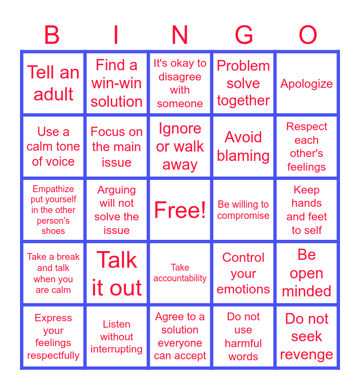 This bingo card has a free space and 24 words: Talk it out, Listen without interrupting, Ignore or walk away, Express your feelings respectfully, Apologize, Tell an adult, Use a calm tone of voice, Find a win-win solution, Be willing to compromise, Take accountability, Avoid blaming, Empathize put yourself in the other person's shoes, Control your emotions, Be open minded, Focus on the main issue, Do not use harmful words, Keep hands and feet to self, It's okay to disagree with someone, Respect each other's feelings, Arguing will not solve the issue, Do not seek revenge, Take a break and talk when you are calm, Problem solve together and Agree to a solution everyone can accept.