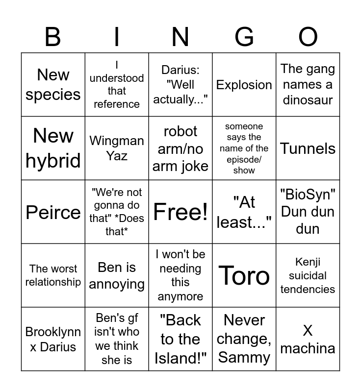 This bingo card has a free space and 24 words: Ben is annoying, Ben's gf isn't who we think she is, robot arm/no arm joke, Brooklynn x Darius, The gang names a dinosaur, New species, New hybrid, I understood that reference, "At least...", I won't be needing this anymore, someone says the name of the episode/ show, Peirce, Toro, Kenji suicidal tendencies, Wingman Yaz, Never change, Sammy, "BioSyn" Dun dun dun, Darius: "Well actually...", Tunnels, "We're not gonna do that" *Does that*, X machina, The worst relationship, Explosion and "Back to the Island!".