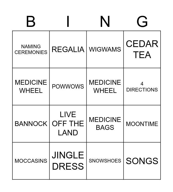 This bingo card has 24 words: Free!, 7 GRANDFATHER TEACHINGS, 4 DIRECTIONS, 4 SACRED MEDICINES, MEDICINE WHEEL, NAMING CEREMONIES, POWWOWS, REGALIA, JINGLE DRESS, RIBBON SKIRT, BANNOCK, MEDICINE BAGS, SINEW, DREAMCATCHERS, MEDICINE WHEEL, BIRCHBARK CANOES, SNOWSHOES, WIGWAMS, LIVE OFF THE LAND, MOONTIME, MOCCASINS, SONGS, CEDAR TEA and CEDAR BATHS.