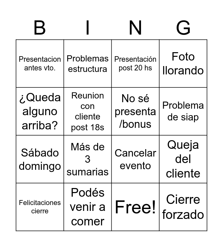 This bingo card has 17 words: Free!, Felicitaciones cierre, Presentación post 20 hs, Presentacion antes vto., Más de 3 sumarias, Foto llorando, Queja del cliente, No sé presenta /bonus, Problema de siap, Reunion con cliente post 18s, Podés venir a comer, Cancelar evento, ¿Queda alguno arriba?, Problemas estructura, Sábado domingo, Post 00:00 and Cierre forzado.