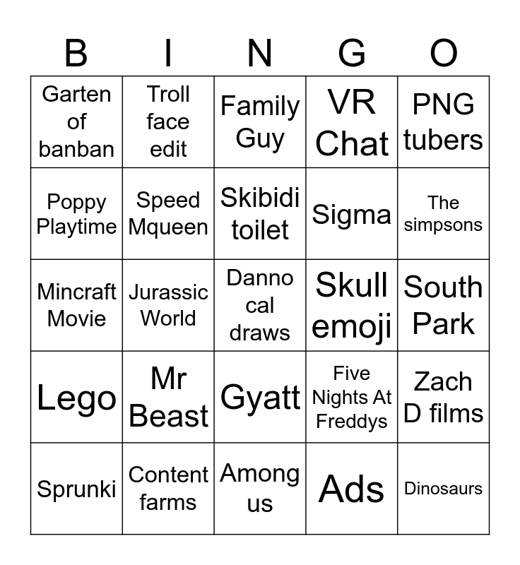 This bingo card has a free space and 24 words: Mr Beast, Content farms, Skibidi toilet, Sprunki, PNG tubers, Garten of banban, Poppy Playtime, Troll face edit, Skull emoji, Gyatt, Sigma, Mincraft Movie, Five Nights At Freddys, Zach D films, Speed Mqueen, Ads, South Park, Family Guy, The simpsons, Jurassic World, Dinosaurs, Lego, VR Chat and Among us.