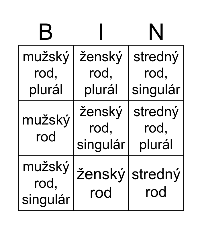 This bingo card has 9 words: mužský rod, singulár, ženský rod, singulár, stredný rod, singulár, mužský rod, plurál, ženský rod, plurál, stredný rod, plurál, mužský rod, ženský rod and stredný rod.