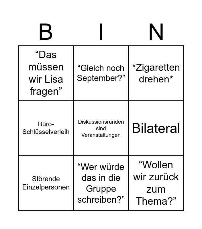 This bingo card has a free space and 8 words: Bilateral, *Zigaretten drehen*, “Gleich noch September?”, Störende Einzelpersonen, “Das müssen wir Lisa fragen”, “Wollen wir zurück zum Thema?”, Büro-Schlüsselverleih and “Wer würde das in die Gruppe schreiben?”.