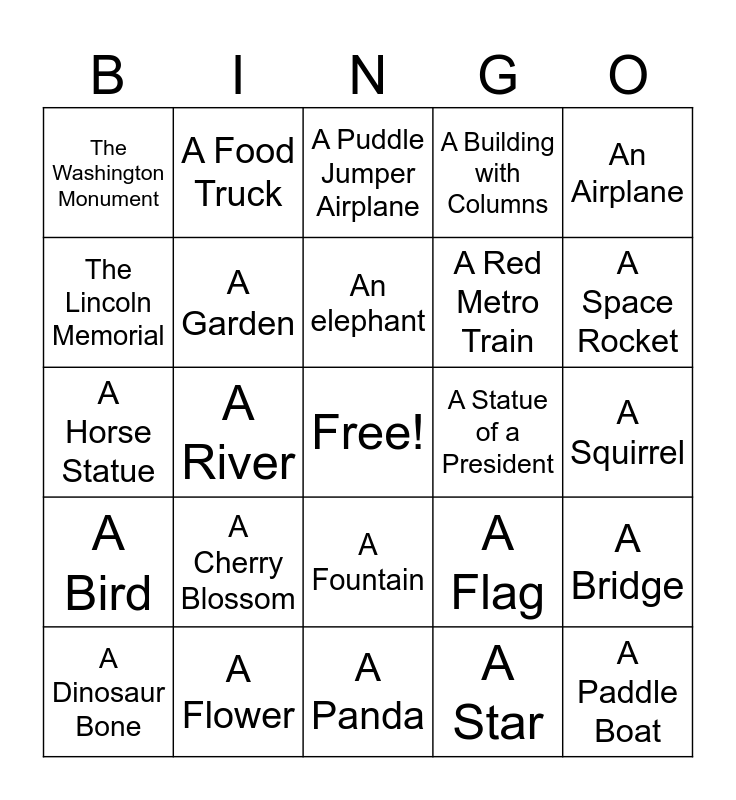 This bingo card has a free space and 25 words: A Cherry Blossom, A Panda, An elephant, A Dinosaur Bone, An Airplane, The Washington Monument, The Lincoln Memorial, A Food Truck, A Statue of a President, A Fountain, A Red Metro Train, A Horse Statue, A Flag, A Bridge, A Garden, A Museum with a Dome, A Squirrel, A Puddle Jumper Airplane, A Space Rocket, A River, A Paddle Boat, A Flower, A Bird, A Building with Columns and A Star.