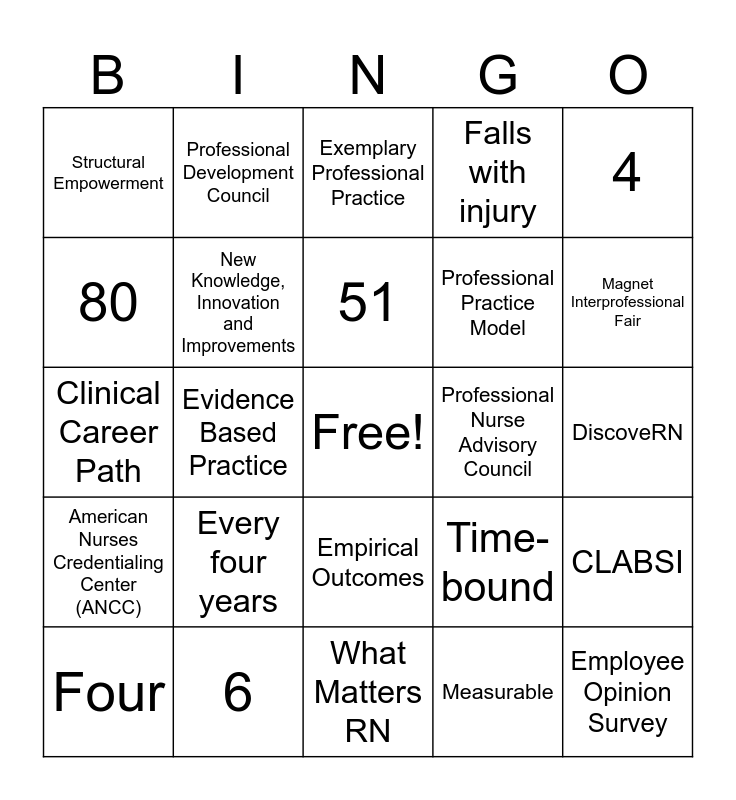This bingo card has a free space and 30 words: 6, Gail Vozzella, Evidence Based Practice, Transformational Leadership, Structural Empowerment, Exemplary Professional Practice, New Knowledge, Innovation and Improvements, Empirical Outcomes, Professional Nurse Advisory Council, What Matters RN, DiscoveRN, Employee Opinion Survey, Measurable, Clinical Inquiry Council, Magnet Interprofessional Fair, Relevant, Time-bound, American Nurses Credentialing Center (ANCC), Every four years, 4, Clinical Career Path, Nurses Gala, Professional Development Council, Professional Practice Model, 80, Falls with injury, CLABSI, Four, 51 and Mentor Match.