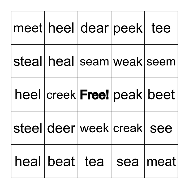 This bingo card has a free space and 24 words: deer, beat, seam, heal, tee, meet, steal, heel, peak, week, weak, heel, creak, see, heal, sea, beet, dear, seem, creek, meat, steel, peek and tea.
