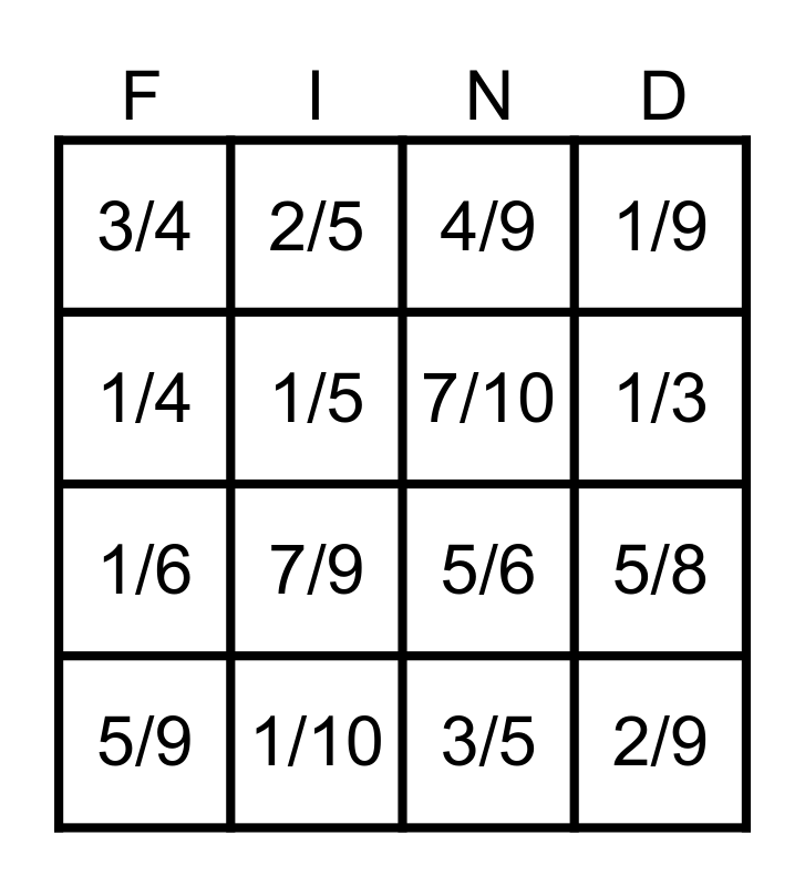 This bingo card has 26 words: Free!, 1/2, 1/3, 2/3, 1/4, 3/4, 1/5, 2/5, 3/5, 4/5, 1/6, 5/6, 1/8, 3/8, 5/8, 7/8, 1/9, 2/9, 4/9, 5/9, 7/9, 8/9, 1/10, 3/10, 7/10 and 9/10.