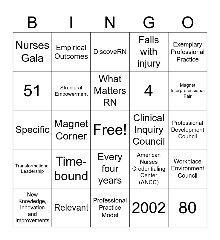 This bingo card has a free space and 34 words: 6, 2002, Gail Vozzella, Evidence Based Practice, Transformational Leadership, Structural Empowerment, Exemplary Professional Practice, New Knowledge, Innovation and Improvements, Empirical Outcomes, Professional Nurse Advisory Council, What Matters RN, DiscoveRN, Employee Opinion Survey, Measurable, Clinical Inquiry Council, Magnet Interprofessional Fair, Relevant, Specific, Time-bound, American Nurses Credentialing Center (ANCC), Every four years, Clinical Career Path, Nurses Gala, Professional Development Council, Professional Practice Model, 80, Falls with injury, CLABSI, 4, 51, Mentor Match, Magnet Corner, Workplace Environment Council and BRAIN.