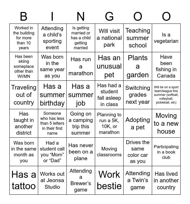 This bingo card has 45 words: Free!, Traveling out of country, Retiring at the end of the year, Going on a camping trip this summer, Moving classrooms, Moving to a new house, Is getting married or has a child getting married, Taking a class, Teaching summer school, Planning to run a 5K, 10K, or marathon, Will visit a national park, Has a summer birthday, Will be on a sport team/league this summer (softball, volleyball, pickleball, etc), Switching grades next year, Work bestie, Adopting a pet, Participating in a book club, Plants a garden, Has tickets to a music concert this summer, Has an unusual pet, Attending a child’s sporting event, Has a tattoo, Drives the same color car as you, Worked in the building for more than 10 years, Was a member of the staff relay race last year/this year, Has a summer job, Had a student call you “Mom” or “Dad”, Has a commute 30 minutes or more, Has taught in another district, Has had a student fall asleep in class, Going on a fishing trip this summer, Someone who has less than 5 letters in their first name, Attending a Brewer’s game, Attending a Twin’s game, Works out at Jeonsa Studio, Have been fishing in Canada, Has never been on a plane, Has lived in another country, Was born in the same month as you, Was born in the same year as you, Is a vegetarian, Has run a marathon, Has not broken a bone, Has been skiing someplace other than WI/MN and Have been to the State Fair.