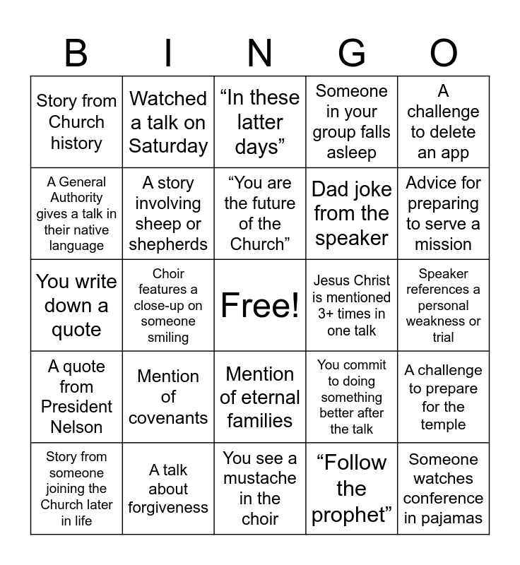 This bingo card has a free space and 24 words: Mention of covenants, A talk about forgiveness, “You are the future of the Church”, Story from someone joining the Church later in life, A challenge to delete an app, Story from Church history, A General Authority gives a talk in their native language, Watched a talk on Saturday, Jesus Christ is mentioned 3+ times in one talk, Mention of eternal families, Dad joke from the speaker, You write down a quote, You commit to doing something better after the talk, A challenge to prepare for the temple, A story involving sheep or shepherds, “Follow the prophet”, Speaker references a personal weakness or trial, “In these latter days”, Advice for preparing to serve a mission, Choir features a close-up on someone smiling, Someone watches conference in pajamas, A quote from President Nelson, Someone in your group falls asleep and You see a mustache in the choir.