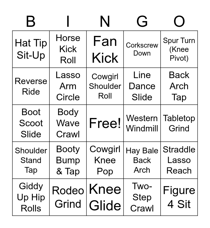 This bingo card has a free space and 24 words: Booty Bump & Tap, Rodeo Grind, Cowgirl Shoulder Roll, Giddy Up Hip Rolls, Spur Turn (Knee Pivot), Hat Tip Sit-Up, Reverse Ride, Horse Kick Roll, Western Windmill, Cowgirl Knee Pop, Line Dance Slide, Boot Scoot Slide, Hay Bale Back Arch, Straddle Lasso Reach, Lasso Arm Circle, Two-Step Crawl, Tabletop Grind, Fan Kick, Back Arch Tap, Body Wave Crawl, Figure 4 Sit, Shoulder Stand Tap, Corkscrew Down and Knee Glide.