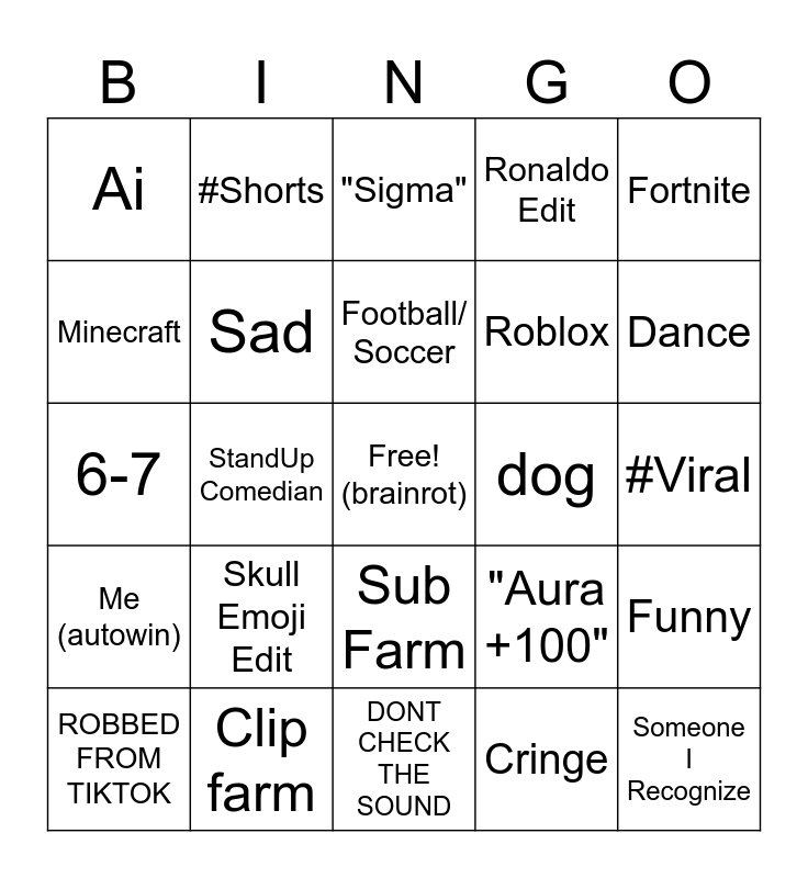 This bingo card has a free space and 24 words: Skull Emoji Edit, Clip farm, Football/ Soccer, ROBBED FROM TIKTOK, Fortnite, Ai, Minecraft, #Shorts, dog, Sub Farm, Roblox, 6-7, "Aura +100", Funny, Sad, Cringe, #Viral, "Sigma", Dance, StandUp Comedian, Someone I Recognize, Me (autowin), Ronaldo Edit and DONT CHECK THE SOUND.