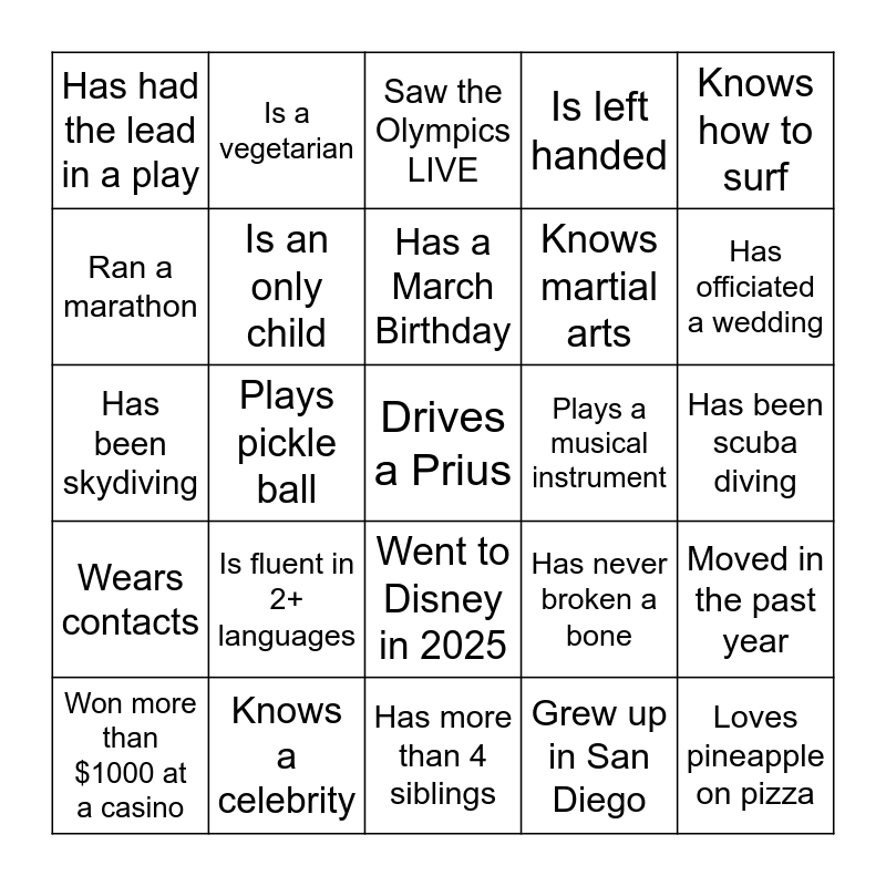 This bingo card has a free space and 24 words: Is fluent in 2+ languages, Knows a celebrity, Has a March Birthday, Won more than $1000 at a casino, Knows how to surf, Has had the lead in a play, Ran a marathon, Is a vegetarian, Plays a musical instrument, Went to Disney in 2025, Knows martial arts, Has been skydiving, Has never broken a bone, Moved in the past year, Is an only child, Grew up in San Diego, Has been scuba diving, Saw the Olympics LIVE, Has officiated a wedding, Plays pickle ball, Loves pineapple on pizza, Wears contacts, Is left handed and Has more than 4 siblings.