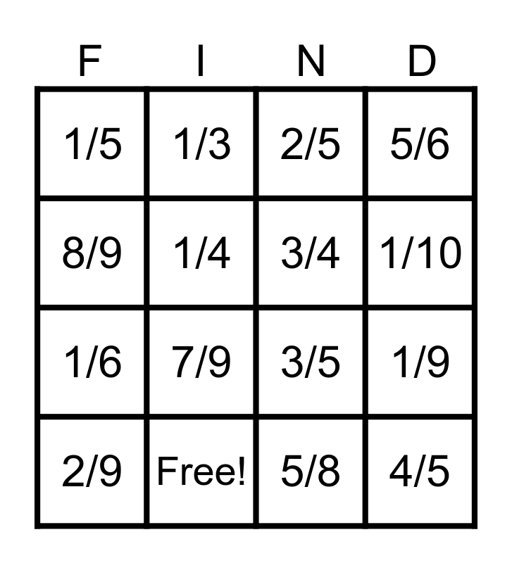 This bingo card has 22 words: Free!, 1/2, 1/3, 2/3, 1/4, 3/4, 1/5, 2/5, 3/5, 4/5, 1/6, 5/6, 1/8, 3/8, 5/8, 7/8, 1/9, 2/9, 7/9, 8/9, 1/10 and 3/10.