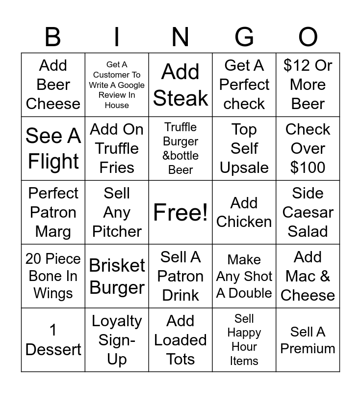 This bingo card has a free space and 24 words: Brisket Burger, Loyalty Sign-Up, Truffle Burger &bottle Beer, 1 Dessert, $12 Or More Beer, Add Beer Cheese, See A Flight, Get A Customer To Write A Google Review In House, Add Chicken, Sell A Patron Drink, Top Self Upsale, Perfect Patron Marg, Make Any Shot A Double, Add Mac & Cheese, Add On Truffle Fries, Sell Happy Hour Items, Side Caesar Salad, Add Steak, Check Over $100, Sell Any Pitcher, Sell A Premium, 20 Piece Bone In Wings, Get A Perfect check and Add Loaded Tots.
