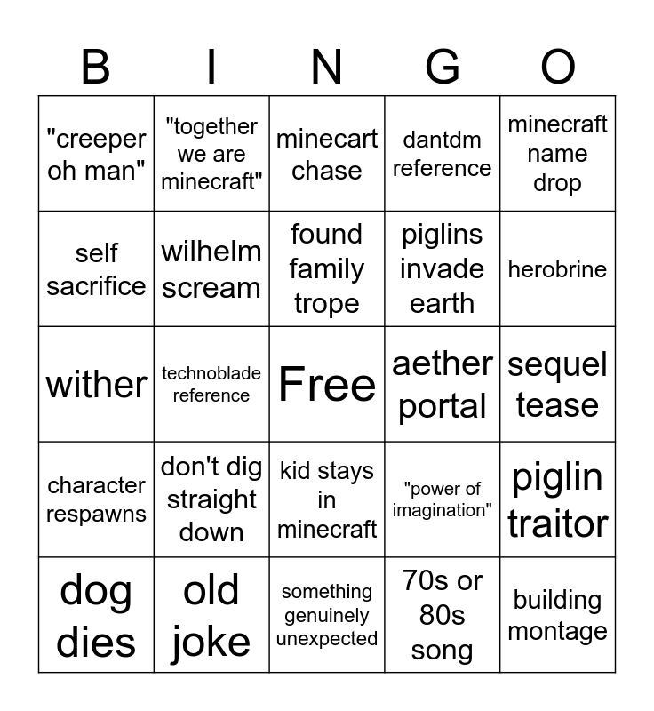 This bingo card has a free space and 24 words: don't dig straight down, old joke, found family trope, dog dies, minecraft name drop, "creeper oh man", self sacrifice, "together we are minecraft", aether portal, kid stays in minecraft, piglins invade earth, wither, "power of imagination", piglin traitor, wilhelm scream, 70s or 80s song, sequel tease, minecart chase, herobrine, technoblade reference, building montage, character respawns, dantdm reference and something genuinely unexpected.