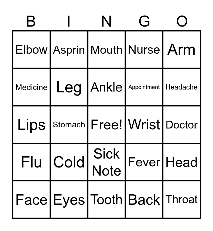 This bingo card has a free space and 29 words: Nose, Eyes, Mouth, Chest, Arm, Elbow, Leg, Ankle, Wrist, Head, Face, Stomach, Back, Throat, Lips, Knee, Tooth, Fever, Headache, Flu, Cold, Sick, Appointment, Doctor, Medicine, Asprin, Sick Note, Nurse and Allergy.