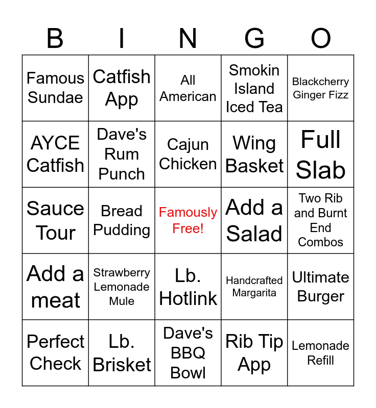 This bingo card has a free space and 29 words: Perfect Check, Shrimp Basket, Bread Pudding, Sampler, Famous Sundae, All American, Dave's Rum Punch, Strawberry Lemonade Mule, Add a Salad, Lb. Brisket, Two Rib and Burnt End Combos, Lemonade Refill, Dave's BBQ Bowl, Rib Tip App, Full Slab, Cheese Curds, Lb. Hotlink, Add a meat, Blackcherry Ginger Fizz, Sauce Tour, Handcrafted Margarita, Feast For 2, Wing Basket, AYCE Catfish, Smokin Island Iced Tea, Catfish App, Ultimate Burger, Cajun Chicken and 3 Meat Combo.
