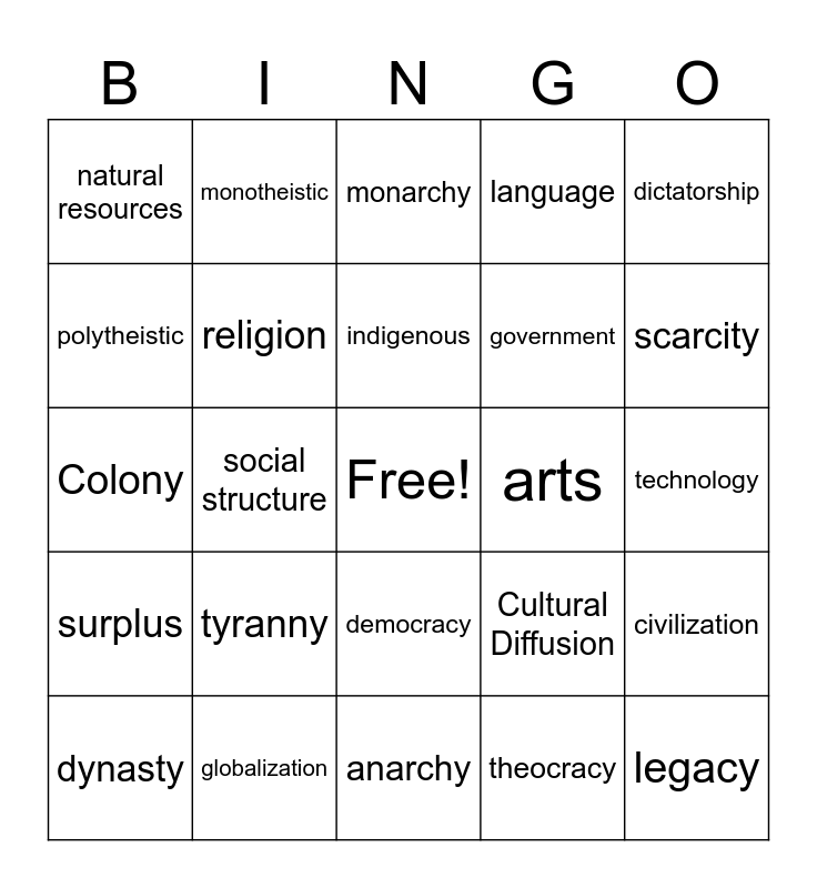 This bingo card has a free space and 27 words: Cultural Diffusion, Silk Road, government, anarchy, polytheistic, monarchy, monotheistic, surplus, arts, civilization, Colony, language, dynasty, globalization, scarcity, stable food supply, religion, indigenous, tyranny, natural resources, technology, theocracy, social structure, legacy, democracy, dictatorship and oligarchy.