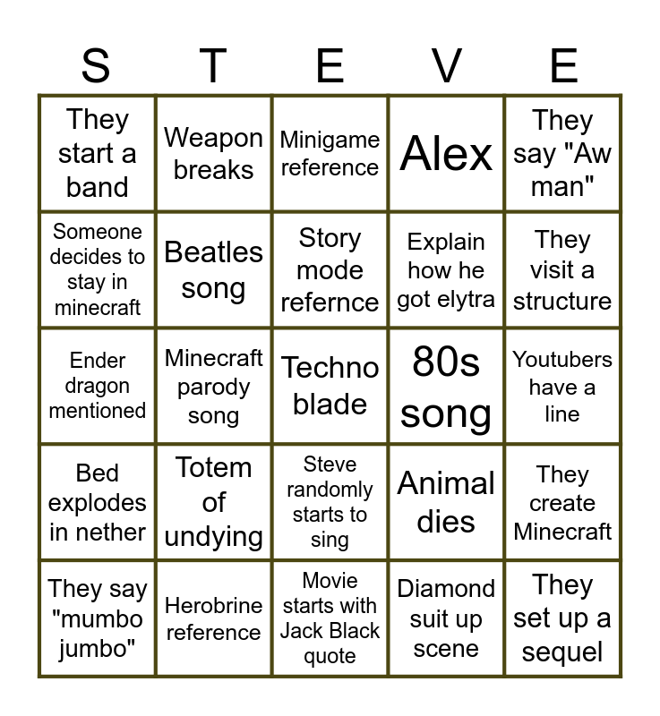 This bingo card has a free space and 24 words: Totem of undying, Herobrine reference, Story mode refernce, They say "mumbo jumbo", They say "Aw man", They start a band, Someone decides to stay in minecraft, Weapon breaks, 80s song, Steve randomly starts to sing, Explain how he got elytra, Ender dragon mentioned, Animal dies, They create Minecraft, Beatles song, Diamond suit up scene, Youtubers have a line, Minigame reference, They visit a structure, Minecraft parody song, They set up a sequel, Bed explodes in nether, Alex and Movie starts with Jack Black quote.
