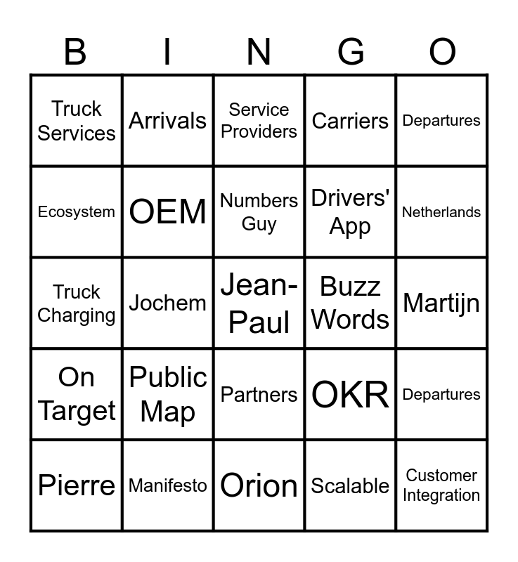 This bingo card has 64 words: KPI, Transactions, "and now for something different", Scalable, Robin Gerritsen Joke, Lighthouse Customer, Arrivals, TMS, Buzz Words, Ultimate Goal, On Target, API, OKR, Departures, Biggest Network, OEM, Numbers Guy, Carriers, Weather Small Talk, Ecosystem, Manifesto, Partners, Drivers' App, Customer Integration, Parking Transactions, Strategic Partners, UMT, Jago, Martijn, Pierre, France, Poland, Solo Drivers, Roadmap, Truck Charging, CuDa, PaDa, System Downtime, Deepdive, Truck Services, Jochem, Jean- Paul, Bas Vissers, Marketing, Action Plan, Public Map, Orion, Rudolf, Netherlands, Truck Washing, Truck Parking, Tank Cleaning, Random GIF in the presentation, Departures, Strategy, Photo of Beer and/or Pizza, Service Providers, Customer Success, Process, Perdoo, Business Update, Amazon, Trafineo and Actuals vs Target.