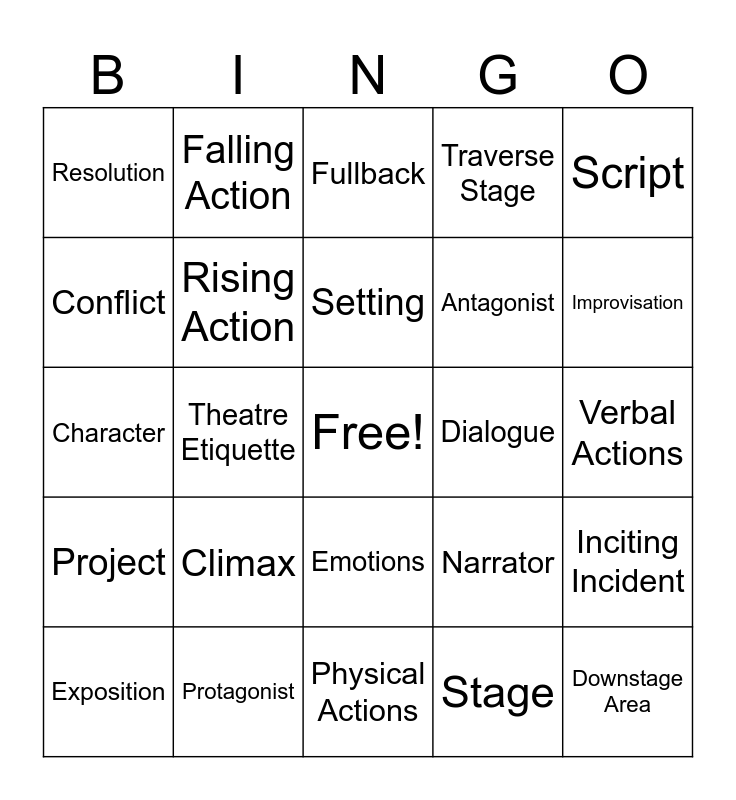 This bingo card has a free space and 24 words: Climax, Protagonist, Setting, Exposition, Script, Resolution, Conflict, Falling Action, Dialogue, Emotions, Antagonist, Character, Narrator, Inciting Incident, Rising Action, Stage, Verbal Actions, Fullback, Improvisation, Theatre Etiquette, Downstage Area, Project, Traverse Stage and Physical Actions.