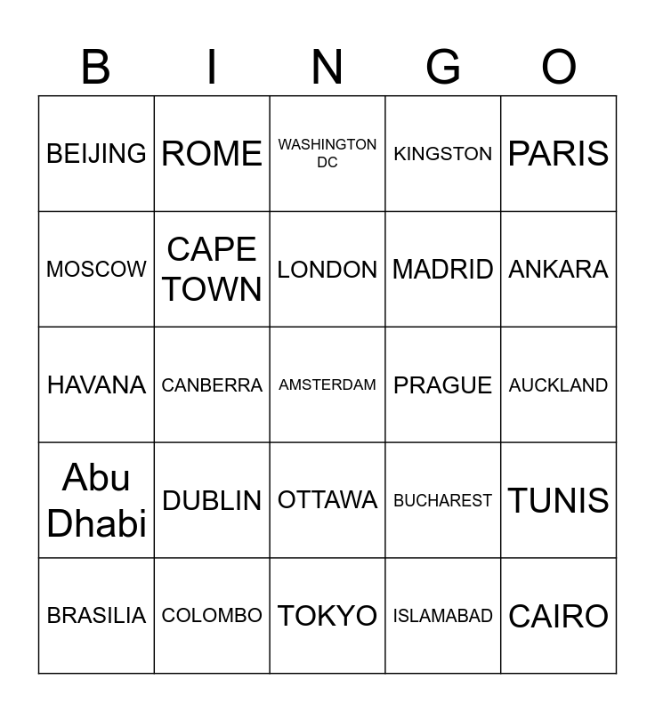 This bingo card has 25 words: DUBLIN, TOKYO, LONDON, BRASILIA, PARIS, BEIJING, MOSCOW, ROME, PRAGUE, OTTAWA, MADRID, HAVANA, BUCHAREST, TUNIS, CAPE TOWN, CAIRO, AUCKLAND, WASHINGTON DC, ANKARA, CANBERRA, AMSTERDAM, COLOMBO, Abu Dhabi, KINGSTON and ISLAMABAD.