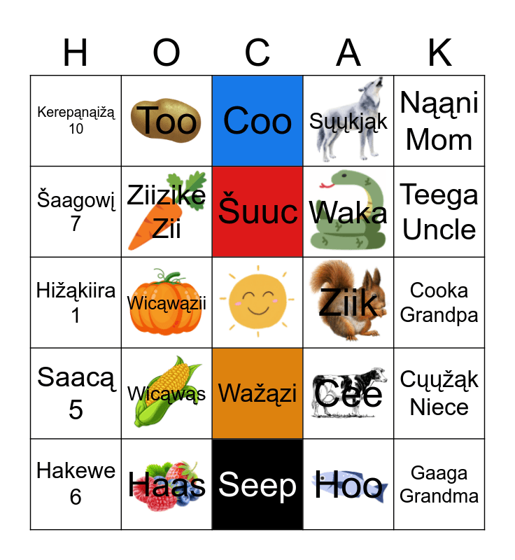 This bingo card has 10 images, a free space and 24 words: Hakewe 6, Wicąwąs, Šuuc, Hoo, Nąąni Mom, Kerepąnąižą 10, Too, Coo, Ziik, Cooka Grandpa, Hižąkiira 1, Ziizike Zii, Cee, Cųųžąk Niece, Šaagowį 7, Haas, Seep, Sųųkjąk, Teega Uncle, Saacą 5, Wicąwązii, Wažązi, Waka and Gaaga Grandma.
