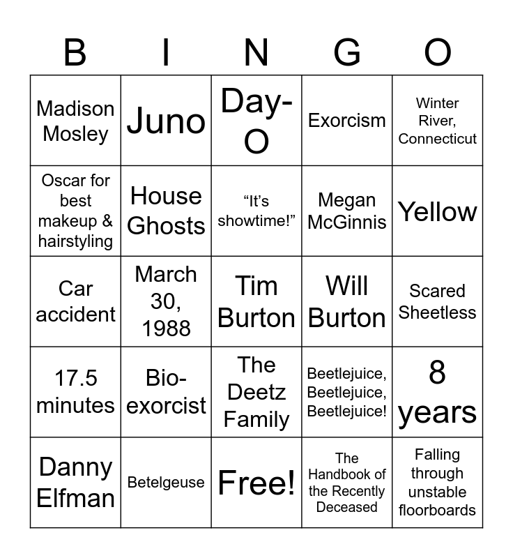 This bingo card has 31 words: Free!, Netherworld, March 30, 1988, Sandworms, Madison Mosley, Day-O, House Ghosts, Beetlejuice, Beetlejuice, Beetlejuice!, Will Burton, The Handbook of the Recently Deceased, Scared Sheetless, Tim Burton, Falling through unstable floorboards, November 4, 2018, Yellow, Justin Colette, 8 years, Bio-exorcist, 17.5 minutes, The Deetz Family, Winter River, Connecticut, Shrimp cocktail, Danny Elfman, Juno, Megan McGinnis, Oscar for best makeup & hairstyling, Exorcism, Car accident, Betelgeuse, “It’s showtime!” and 92 minutes.