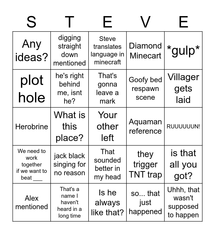 This bingo card has 41 words: He's right behind me, isn't he, Herobrine, And ____ you just be ____, he's right behind me, isnt he?, That's a name I haven't heard in a long time, That sounded better in my head, That's gonna leave a mark, Butter gold, *gulp*, We need to work together if we want to beat ___, What is this place?, Diamond Minecart, Your other left, RUUUUUUN!, Aquaman reference, jack black singing for no reason, We have no other choice, Any ideas?, Yeeah, let's try that again, Steve translates language in minecraft, is that all you got?, Uhhh, that wasn't supposed to happen, Is he always like that?, Goofy bed respawn scene, Notch replace another word, someone with way too many dogs (bonus points if they die), so... that just happened, Basically the jumaji plot, Villager gets laid, obvious product placement, cube sized planet, digging straight down mentioned, Alex mentioned, upside down mob called dinnerbone, they trigger TNT trap, plot hole, aww man, Youtuber's name mentioned, villager saves the day, corprate entity wants to enter minecraft (bonus points if jewish) and Aether.
