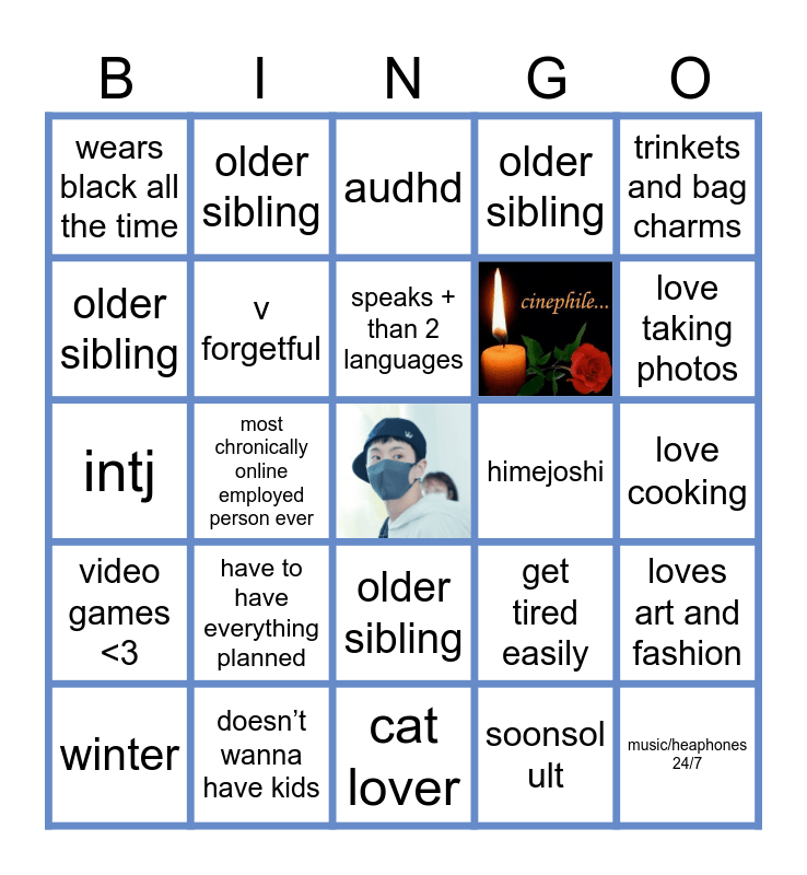 This bingo card has 1 images, a free space and 28 words: older sibling, doesn’t wanna have kids, audhd, loops the same song for hours, trinkets and bag charms, wears black all the time, v forgetful, speaks + than 2 languages, himejoshi, loves art and fashion, winter, most chronically online employed person ever, soonsol ult, music/heaphones 24/7, intj, tattoos and piercings, cat lover, get tired easily, love taking photos, video games <3, have to have everything planned, coffee, love cooking, older sibling, older sibling, older sibling, older sibling and older sibling.