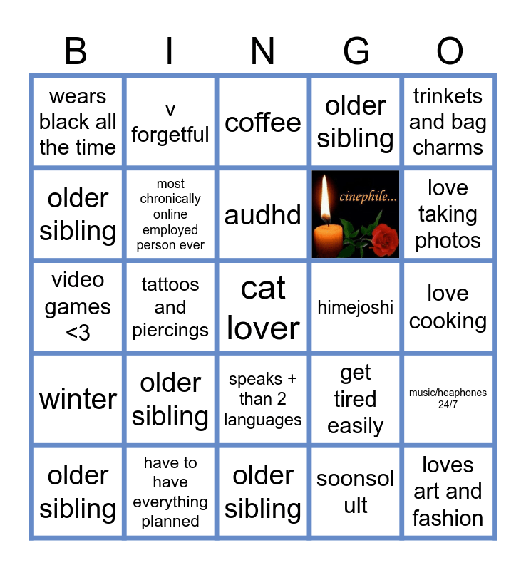 This bingo card has 2 images and 28 words: older sibling, doesn’t wanna have kids, audhd, loops the same song for hours, trinkets and bag charms, wears black all the time, v forgetful, speaks + than 2 languages, himejoshi, loves art and fashion, winter, most chronically online employed person ever, soonsol ult, music/heaphones 24/7, intj, tattoos and piercings, cat lover, get tired easily, love taking photos, video games <3, have to have everything planned, coffee, love cooking, older sibling, older sibling, older sibling, older sibling and older sibling.