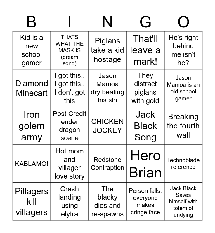 This bingo card has a free space and 24 words: Hot mom and villager love story, Crash landing using elytra, Jason Mamoa dry beating his shi, Pillagers kill villagers, He's right behind me isn't he?, Kid is a new school gamer, Diamond Minecart, THATS WHAT THE MASK IS (dream song), Jack Black Song, Redstone Contraption, They distract piglans with gold, Iron golem army, Hero Brian, Technoblade reference, I got this.. I got this.. I don't got this, Person falls, everyone makes cringe face, Breaking the fourth wall, Piglans take a kid hostage, Jason Mamoa is an old school gamer, Post Credit ender dragon scene, Jack Black Saves himself with totem of undying, KABLAMO!, That'll leave a mark! and The blacky dies and re-spawns.
