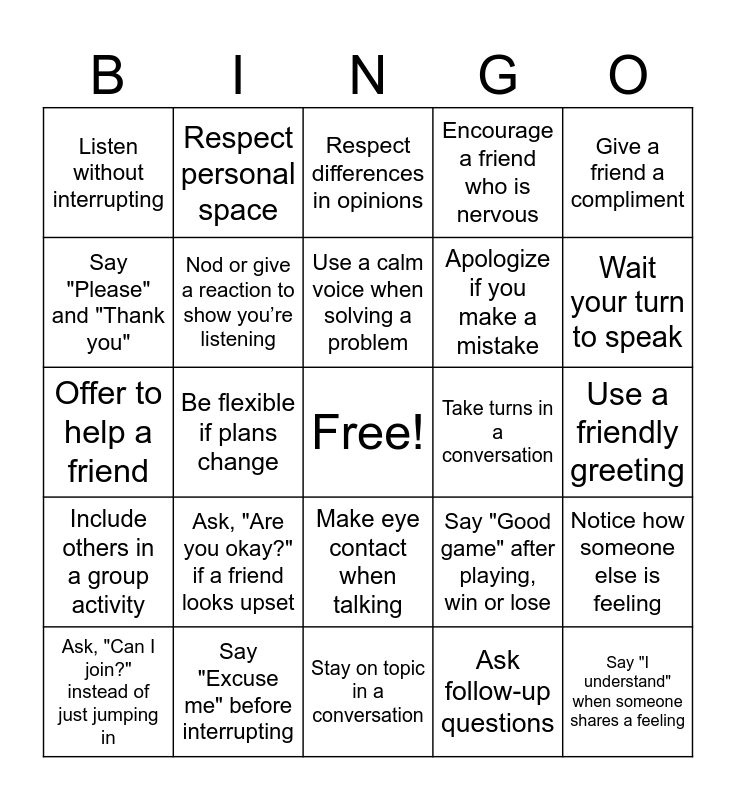 This bingo card has a free space and 24 words: Ask, "Are you okay?" if a friend looks upset, Say "Excuse me" before interrupting, Use a calm voice when solving a problem, Ask, "Can I join?" instead of just jumping in, Give a friend a compliment, Listen without interrupting, Say "Please" and "Thank you", Respect personal space, Take turns in a conversation, Make eye contact when talking, Apologize if you make a mistake, Offer to help a friend, Say "Good game" after playing, win or lose, Notice how someone else is feeling, Nod or give a reaction to show you’re listening, Ask follow-up questions, Use a friendly greeting, Respect differences in opinions, Wait your turn to speak, Be flexible if plans change, Say "I understand" when someone shares a feeling, Include others in a group activity, Encourage a friend who is nervous and Stay on topic in a conversation.