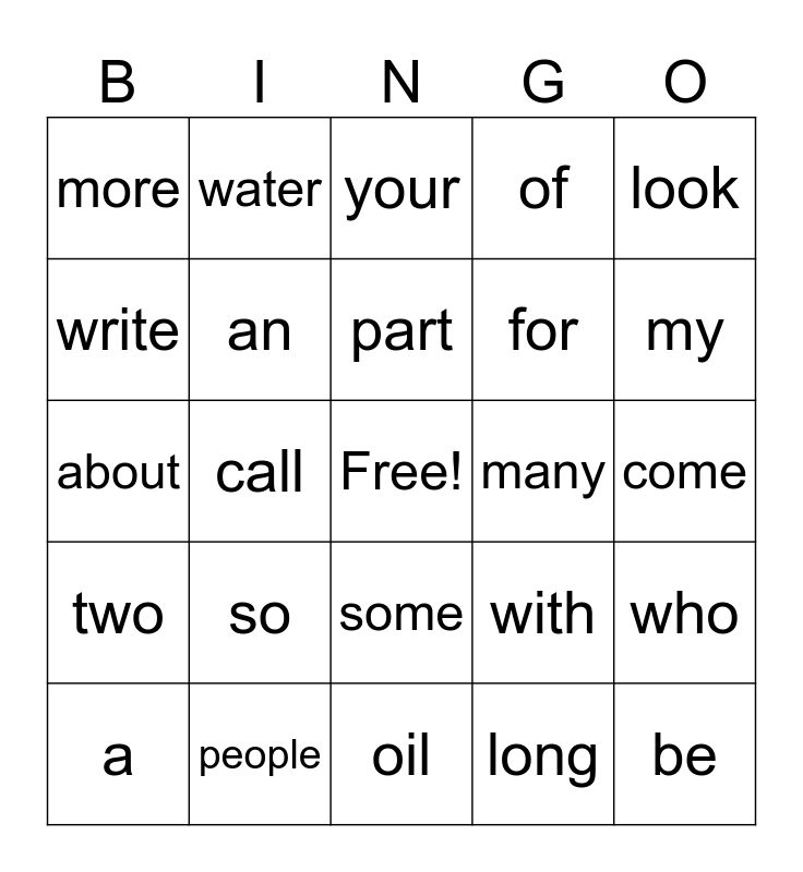 This bingo card has a free space and 24 words: so, people, part, a, look, more, write, water, many, some, for, about, with, who, an, long, come, your, my, call, be, two, of and oil.