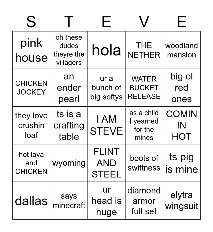 This bingo card has a free space and 24 words: wyoming, says minecraft, ur a bunch of big softys, dallas, woodland mansion, pink house, CHICKEN JOCKEY, oh these dudes theyre the villagers, as a child I yearned for the mines, FLINT AND STEEL, WATER BUCKET RELEASE, they love crushin loaf, boots of swiftness, ts pig is mine, an ender pearl, diamond armor full set, COMIN IN HOT, hola, big ol red ones, ts is a crafting table, elytra wingsuit, hot lava and CHICKEN, THE NETHER and ur head is huge.