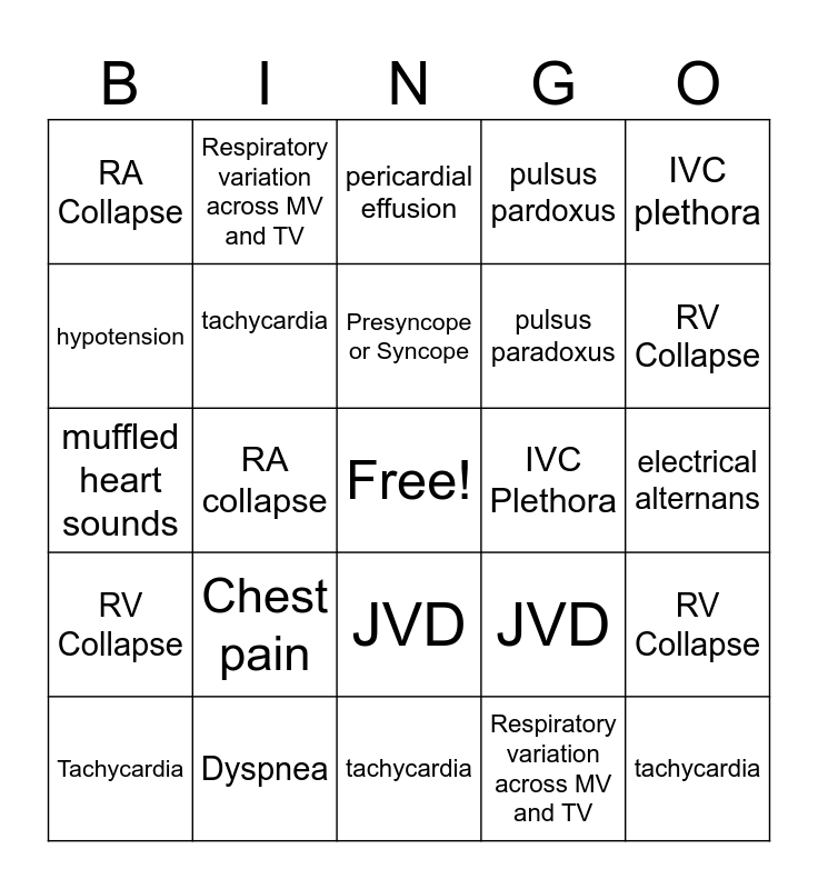 This bingo card has a free space and 24 words: Chest pain, Dyspnea, Presyncope or Syncope, Tachycardia, IVC plethora, RA Collapse, hypotension, Respiratory variation across MV and TV, IVC Plethora, JVD, pulsus paradoxus, muffled heart sounds, JVD, RV Collapse, tachycardia, Respiratory variation across MV and TV, electrical alternans, pericardial effusion, RV Collapse, RA collapse, tachycardia, RV Collapse, pulsus pardoxus and tachycardia.