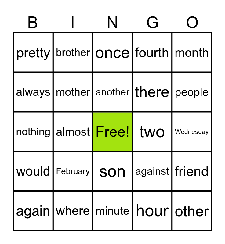 This bingo card has a free space and 24 words: February, where, another, again, month, pretty, always, brother, two, son, there, nothing, against, friend, mother, hour, Wednesday, once, people, almost, other, would, fourth and minute.