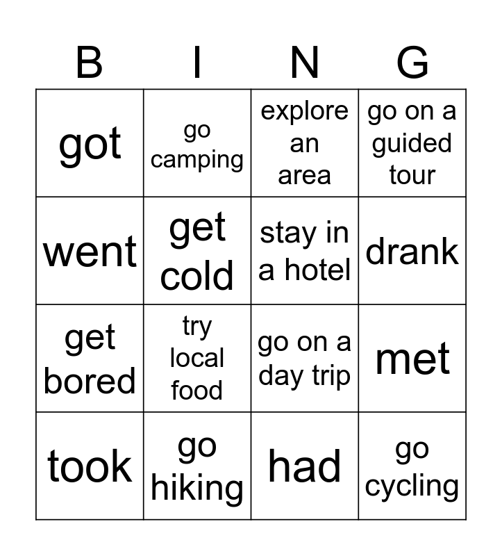 This bingo card has 27 words: get lost, get tired, get bored, get dark, get cold, explore an area, go camping, go cycling, go hiking, go on a boat trip, go on a day trip, go on a guided tour, go snorkelling, go to the beach, try local food, go sightseeing, stay in a hotel, drank, gave, got, had, left, met, took, spent, went and swam.