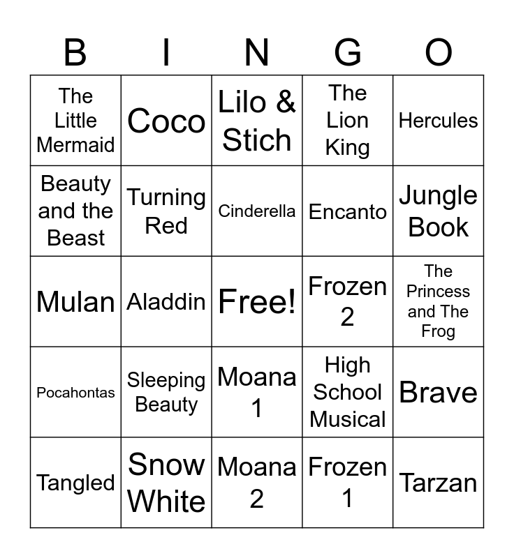 This bingo card has a free space and 26 words: Moana 1, Frozen 1, Cinderella, Snow White, Hercules, The Little Mermaid, Beauty and the Beast, Coco, The Princess and The Frog, High School Musical, Encanto, Mulan, Brave, Tangled, Aladdin, Toy Story, The Lion King, Pocahontas, Lilo & Stich, Tarzan, Jungle Book, Moana 2, Frozen 2, Sleeping Beauty, Turning Red and Enchanted.