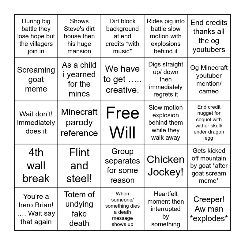 This bingo card has a free space and 24 words: Flint and steel!, Totem of undying fake death, We have to get ….. creative., You’re a hero Brian! …. Wait say that again, End credits thanks all the og youtubers, During big battle they lose hope but the villagers join in, Screaming goat meme, Shows Steve's dirt house then his huge mansion, Slow motion explosion behind them while they walk away, Group separates for some reason, Digs straight up/ down then immediately regrets it, Wait don’t! immediately does it, Chicken Jockey!, Gets kicked off mountain by goat *after goat scream meme*, As a child i yearned for the mines, Heartfelt moment then interrupted by something, End credit nugget for sequel with wither skull/ ender dragon egg, Dirt block background at end credits *with music*, Og Minecraft youtuber mention/ cameo, Minecraft parody reference, Creeper! Aw man *explodes*, 4th wall break, Rides pig into battle slow motion with explosions behind it and When someone/ something dies a death message shows up.