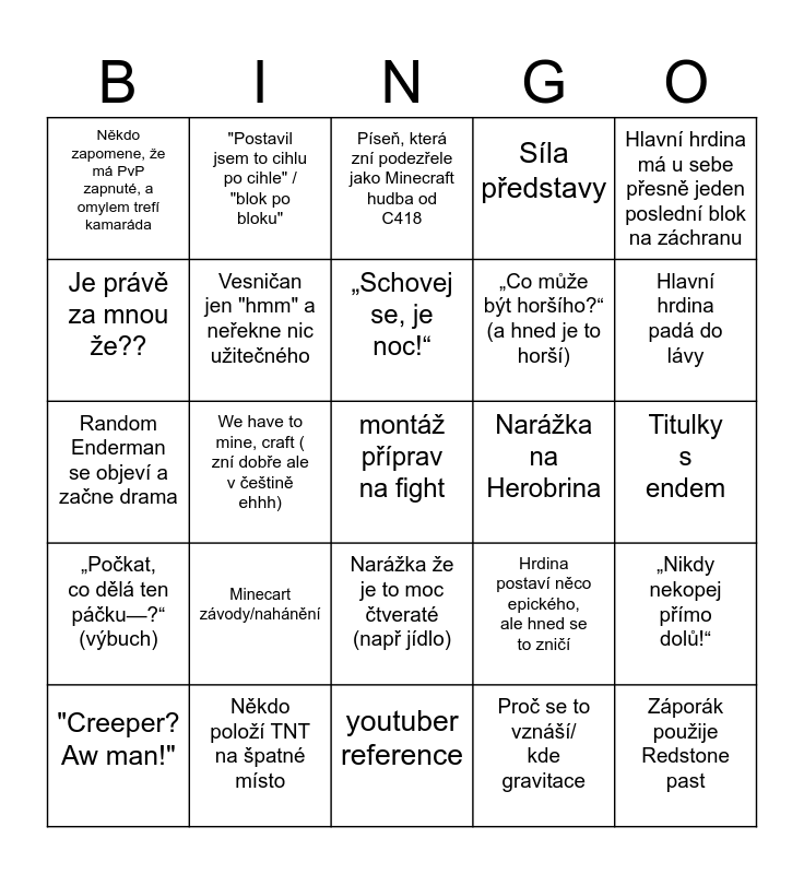 This bingo card has a free space and 24 words: Minecart závody/nahánění, Někdo položí TNT na špatné místo, „Schovej se, je noc!“, "Creeper? Aw man!", Hlavní hrdina má u sebe přesně jeden poslední blok na záchranu, Někdo zapomene, že má PvP zapnuté, a omylem trefí kamaráda, Je právě za mnou že??, "Postavil jsem to cihlu po cihle" / "blok po bloku", Narážka na Herobrina, Narážka že je to moc čtveraté (např jídlo), „Co může být horšího?“ (a hned je to horší), Random Enderman se objeví a začne drama, Hrdina postaví něco epického, ale hned se to zničí, „Nikdy nekopej přímo dolů!“, Vesničan jen "hmm" a neřekne nic užitečného, Proč se to vznáší/ kde gravitace, Titulky s endem, Píseň, která zní podezřele jako Minecraft hudba od C418, Hlavní hrdina padá do lávy, We have to mine, craft ( zní dobře ale v češtině ehhh), Záporák použije Redstone past, „Počkat, co dělá ten páčku—?“ (výbuch), Síla představy and youtuber reference.